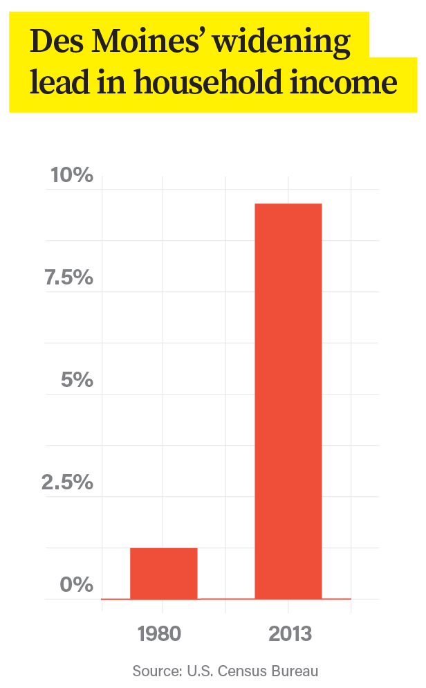 ABOVE: Des Moines has maintained an edge over Wichita in household income since the 1980s. That lead has only widened since.