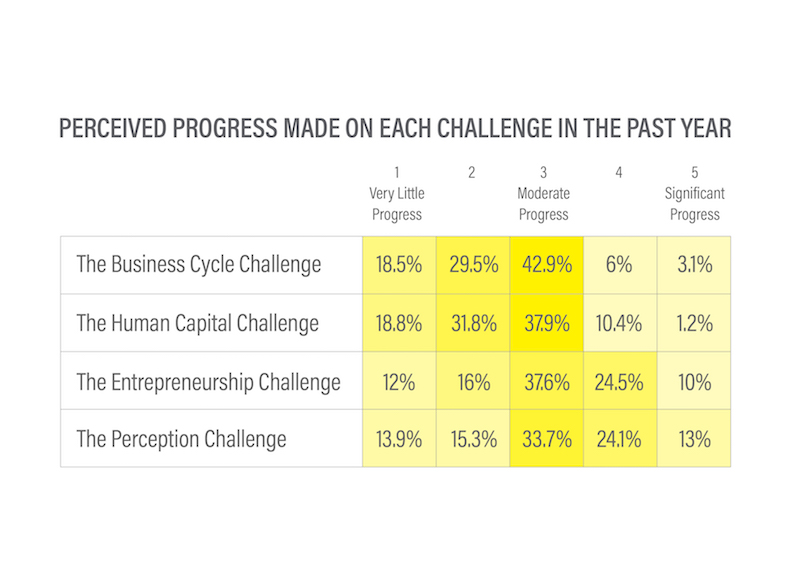 Respondents felt that progress had been made on all of the Four Challenges, but entrepreneurship and perception were weighted toward more progress, while human capital and business cycle were weighted to less.