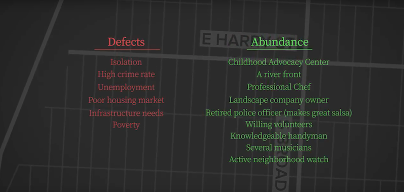 This is called asset-based community development, which was developed through research by the Asset-based Community Development (ABCD) Institute at DePaul University. Using this method has been linked to increased employment, reduced crime and decreases in things like truancy, domestic abuse and even food scarcity.